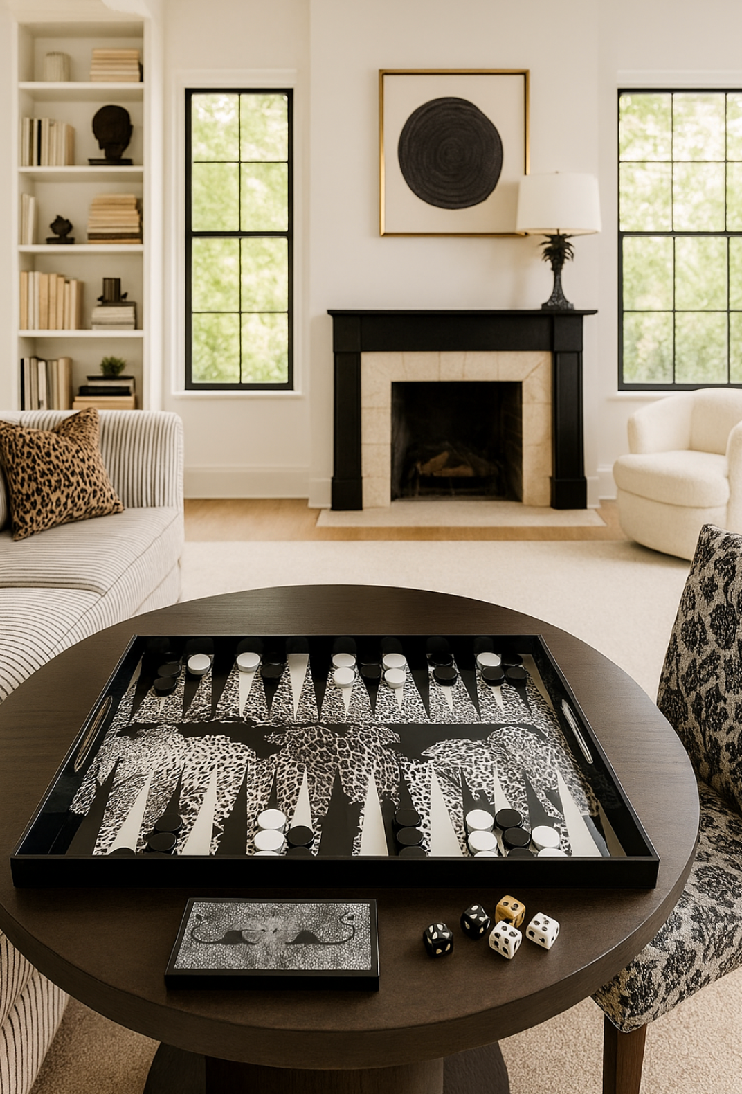 acrylic backgammon set, lucite backgammon board, leopard backgammon set, modern backgammon board, luxury game set, acrylic game board, coffee table game set, designer board games for home decor