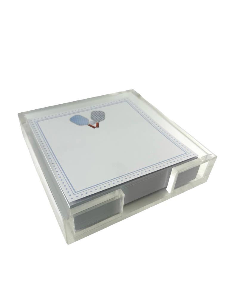 Crafted from clear, durable acrylic, the sleek lucite holder includes premium white note paper perfect for everyday notes and messages. The modern design blends effortlessly with any décor while bringing a playful pickleball inspired touch to your workspace.