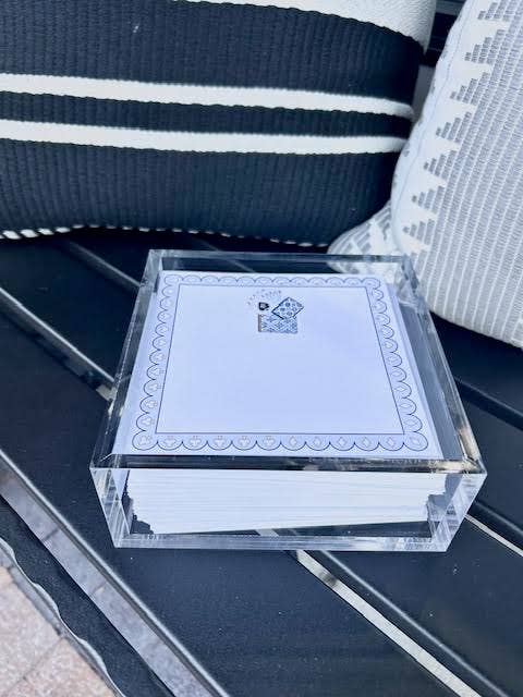 Acrylic note holder, paper block holder, desk accessories, home office décor, hostess gift, modern acrylic tray, reusable napkin holder, wholesale stationery, clear acrylic organizer, stylish desk gift.